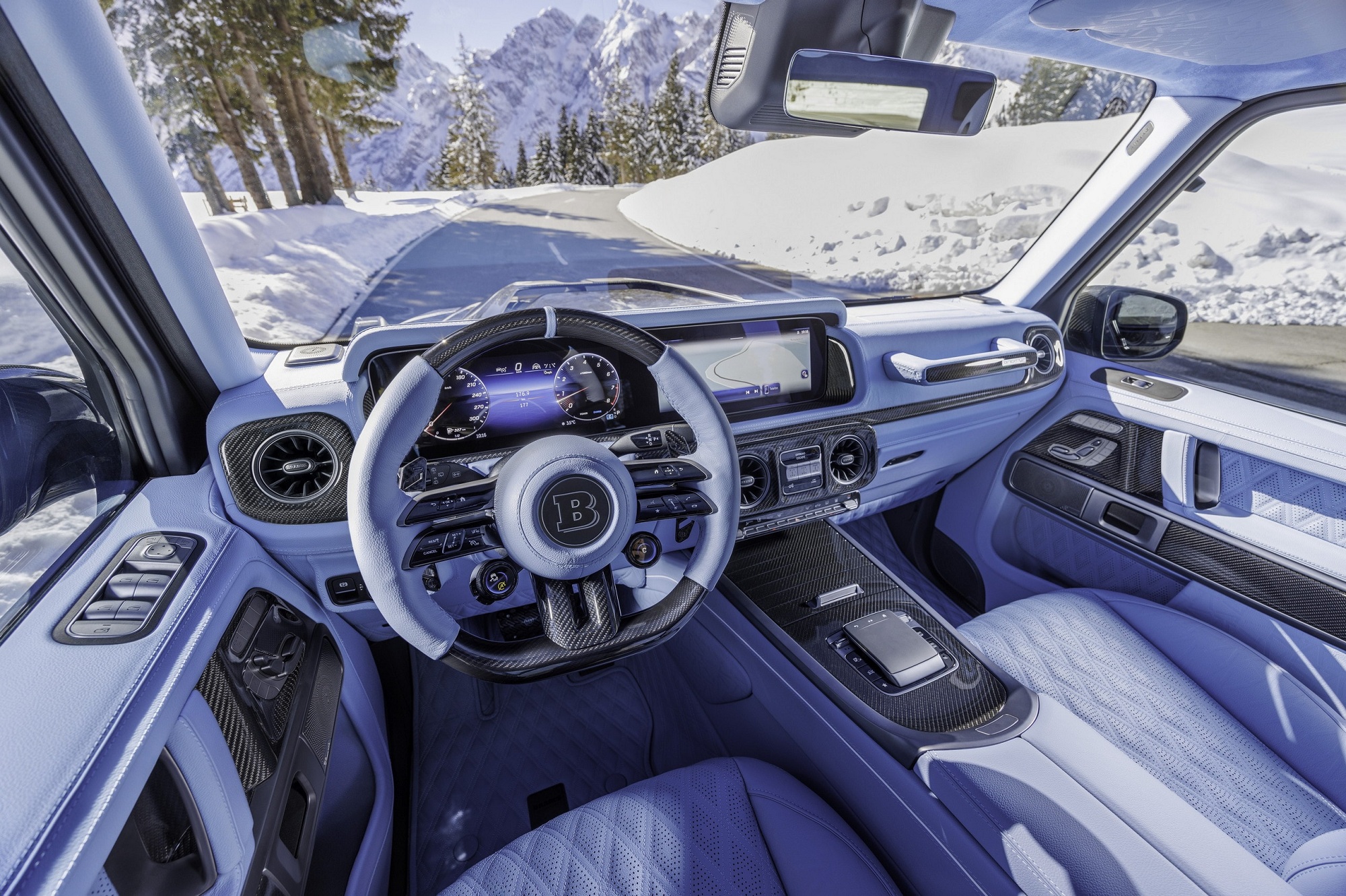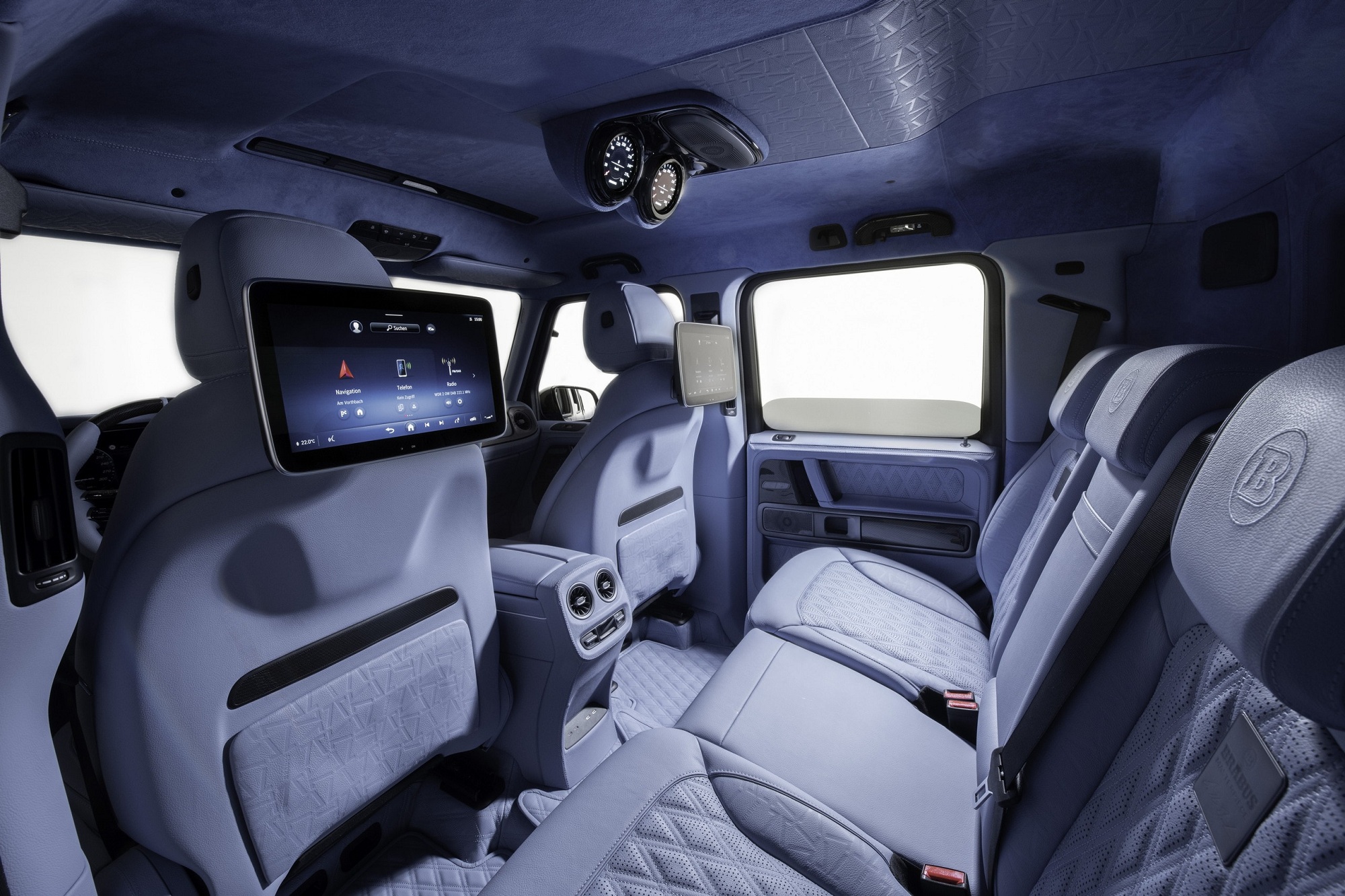 Салон Mercedes G-Class Brabus отделали кожей, замшей, карбоном и алюминием. Для задних пассажиров установили отдельные циферблаты приборов на потолке.