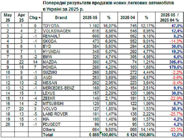 Лидерство на рынке сохраняет марка Toyota — 1102 проданных автомобиля за месяц. На второе место поднялся Volkswagen (616 авто), подвинув на третью позицию Renault (608 ед.).