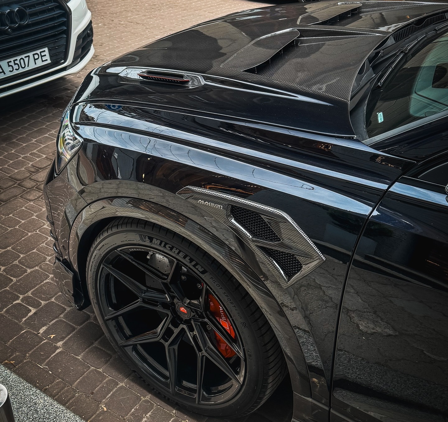Кроссовер Audi RS Q8 получил карбоновый пакет. Из углеволокна выполнили обвес, капот, расширители арок, спойлер на крыше и разнообразный декор. Также установили 23-дюймовые диски с низкопрофильными шинами Michelin Pilot SUV.