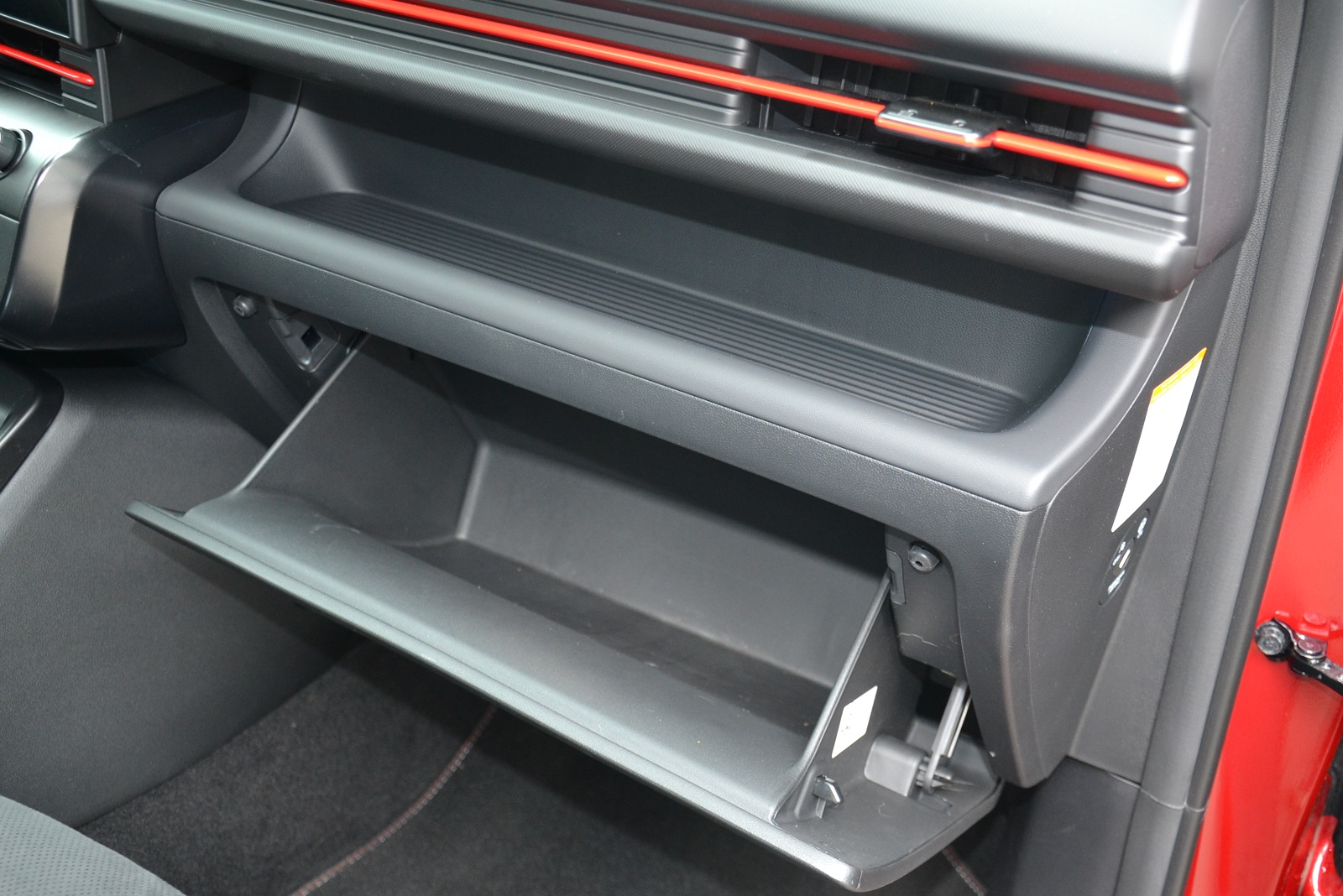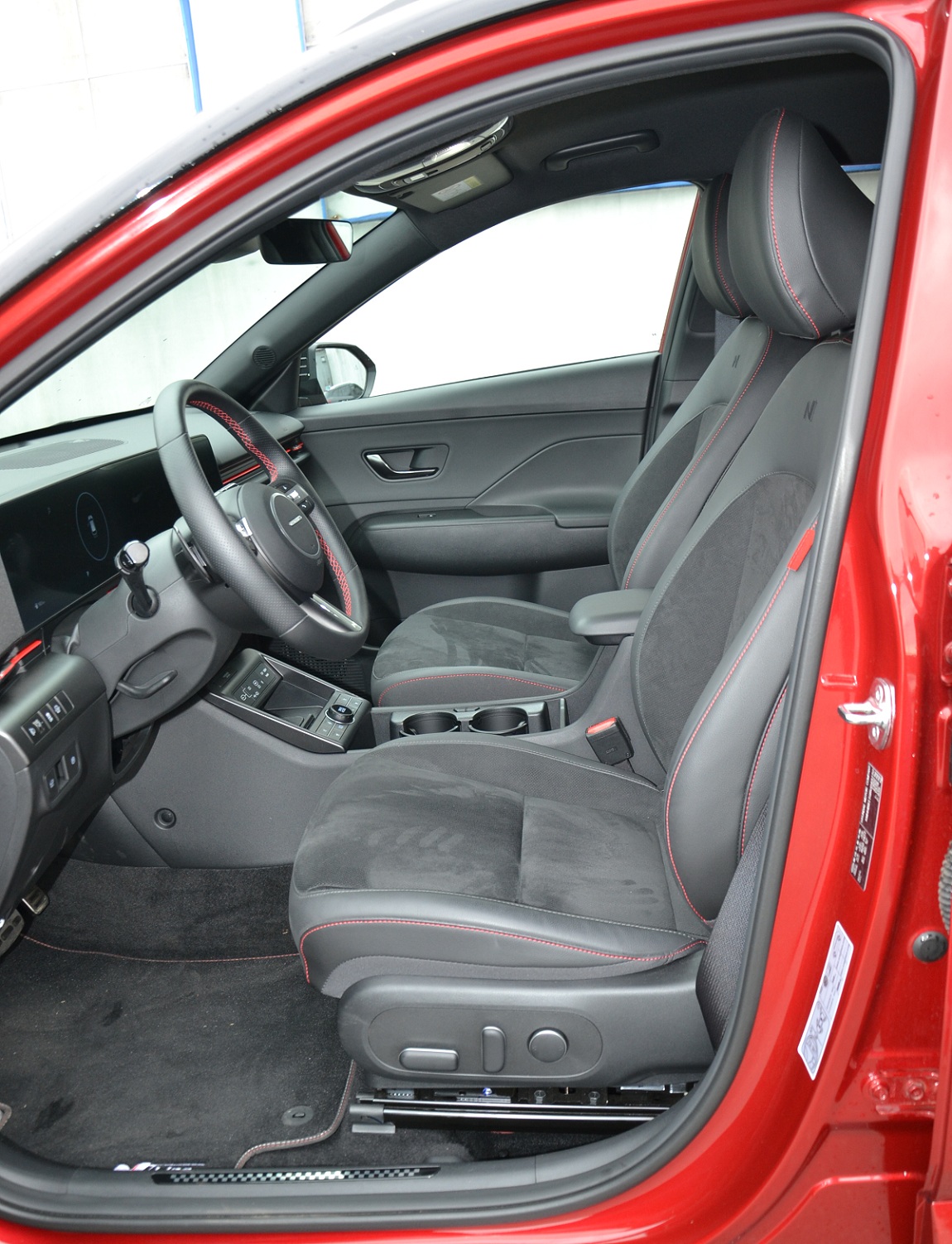 Во внутренней отделке Hyundai Kona N-Line использованы искусственная кожа и алькантара с контрастными красными швами. На руле кожа перфорирована, а педали украшены металлическими накладками. В то же время, стоит отметить, что в салоне хватает и жестковатого пластика.