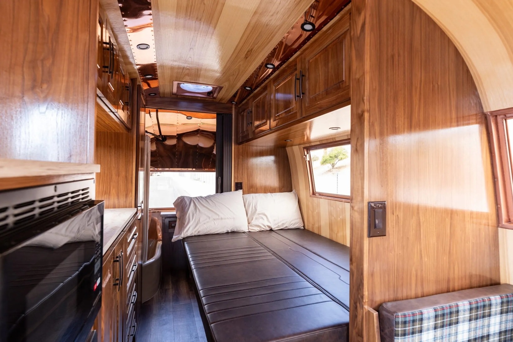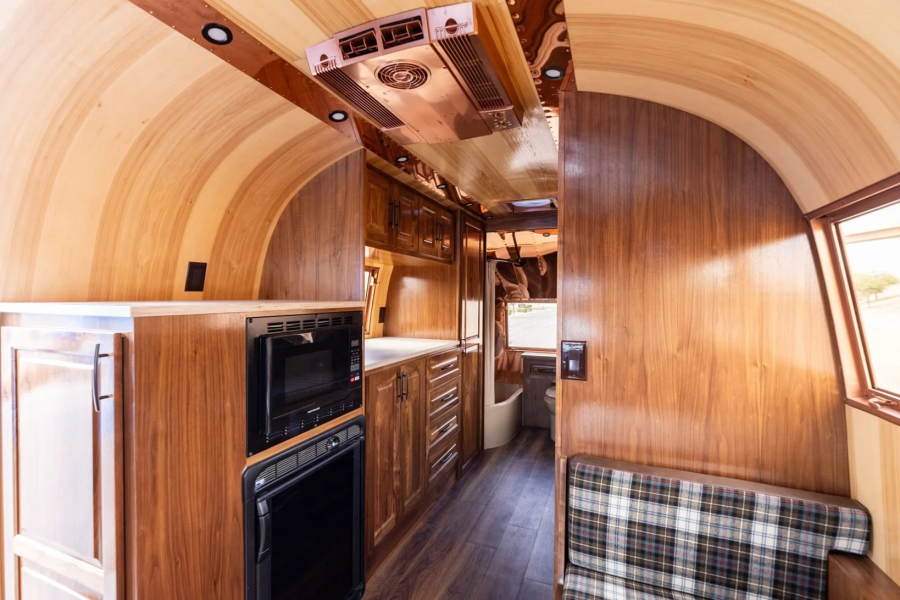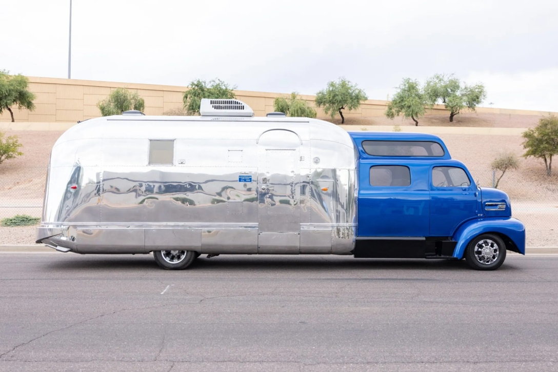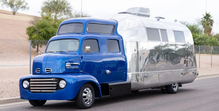 Кабину Ford COE удлинили и соединили с классическим стальным кемпером Airstream и установили конструкцию на рамное шасси General Motors P30. Дом на колесах достигает 9 метров в длину.