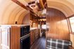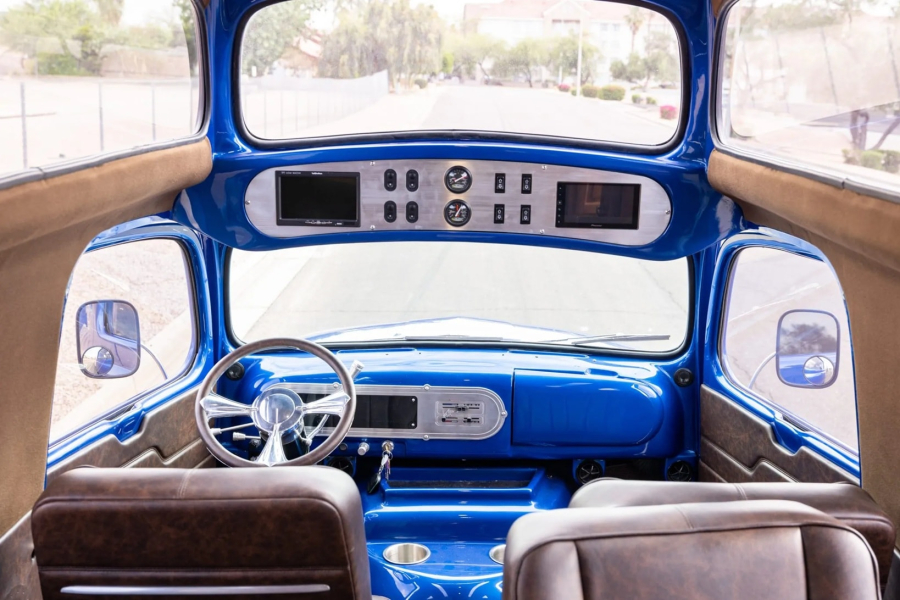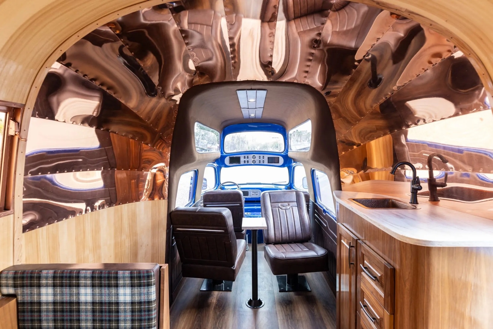 Салон Ford COE отделали кожей, деревом и полированной медью. Внутри установили деревянную мебель, поворотные кресла и раскладной диван. На кухне появились раковина, духовка, холодильник и микроволновая печь, а рядом установили стол и скамейки.