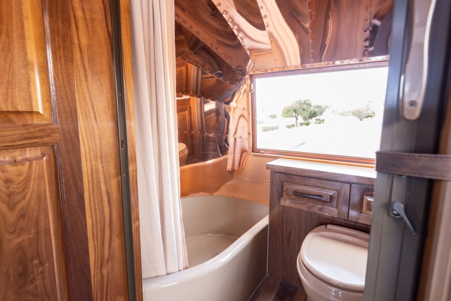 В задней части оборудовали полноценный санузел. Также есть телевизор, кондиционер, камера заднего вида и бойлер. К тому же, дом на колесах оснащен генератором, 95-литровым баком для воды и 132-литровой емкостью для отходов.