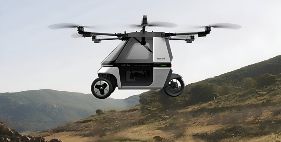 В воздухе летающий мотоцикл передвигается благодаря шести пропеллерам. Максимальная скорость составляет 72 км/ч.