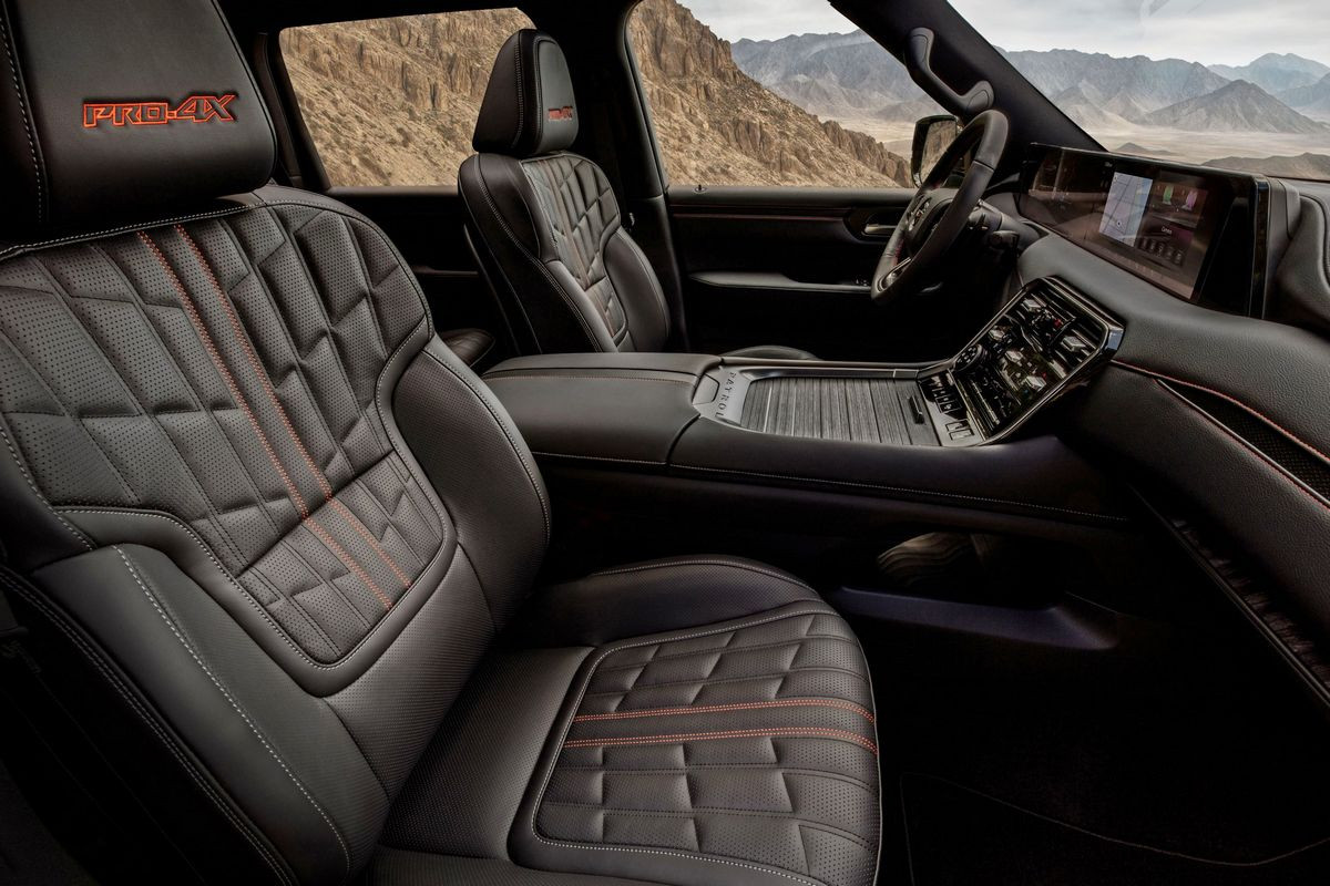 Салон Nissan Patrol Pro-4X отделали более выносливыми материалами. Кожу разбавили оранжевыми швами и вставками.