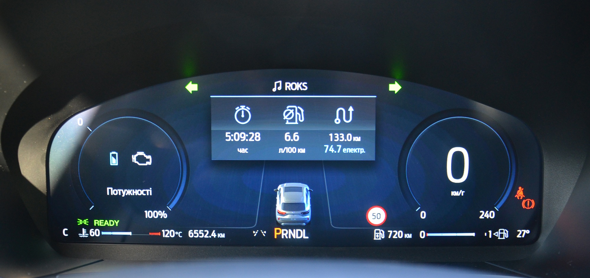 Гибридная установка работает тихо даже в спортивном режиме и вариатор плавный. Интересная деталь: в городе авто старается как можно большую дистанцию преодолеть на электротяге. Во время нашего теста примерно половину дистанции гибрид Ford Kuga проехал в электрическом режиме.