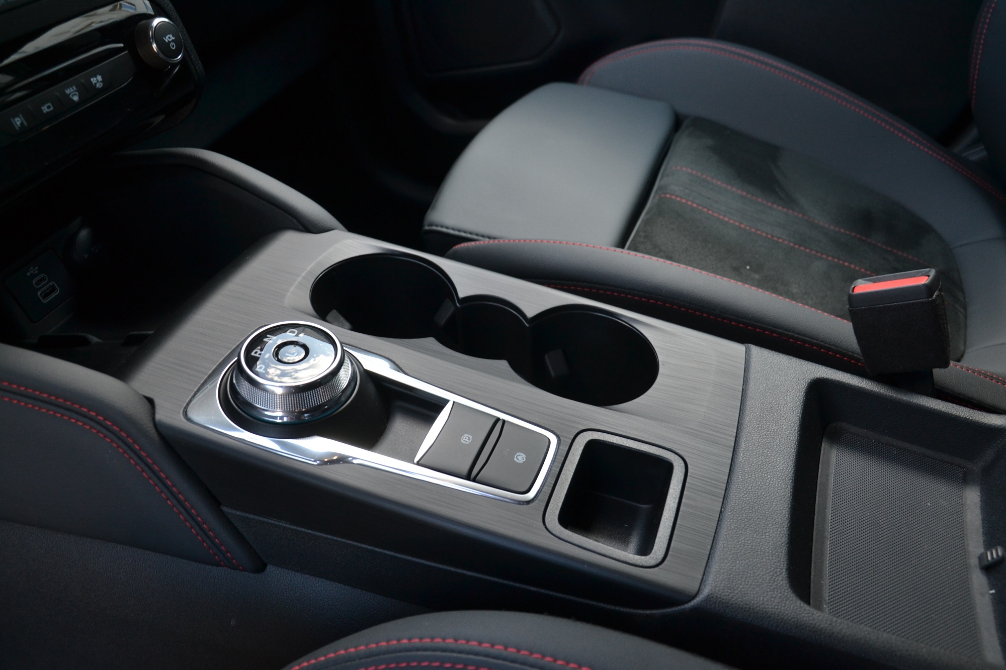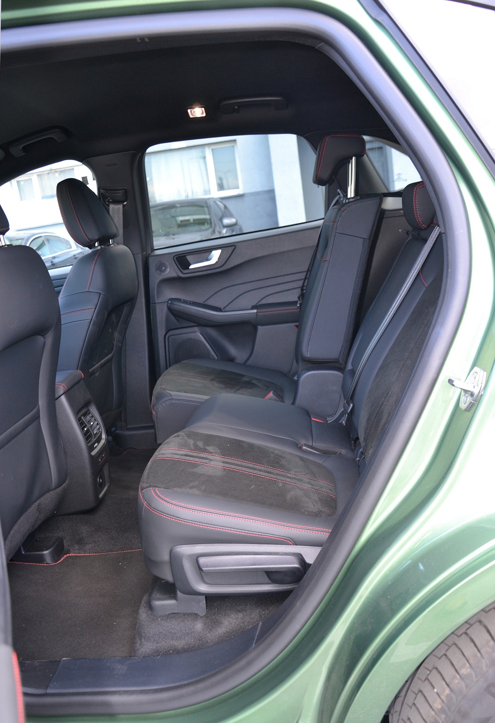 Заглянем внутрь. В отделке у Ford Kuga ST-Line X Plus использованы экокожа и замша с контрастными красными швами и вставками "под карбон". Педали украшены металлическими накладками. В целом, качество материалов салона довольно неплохое и жесткого пластика мало.