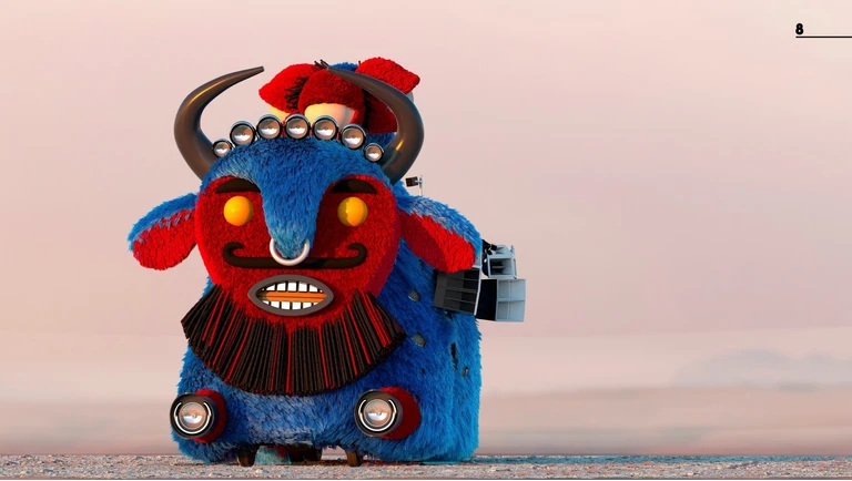 Огромный арткар разработала и построила вручную команда "Мастерская чудес" во главе с Митей Зиновьевым. Он вдохновлен знаменитой картиной Марии Примаченко "Синий бык" 1947 года.