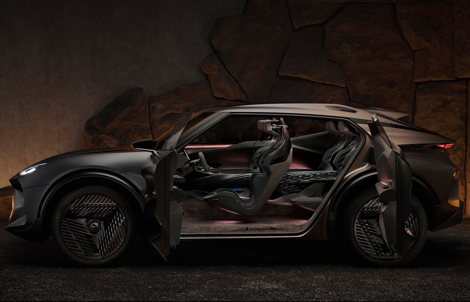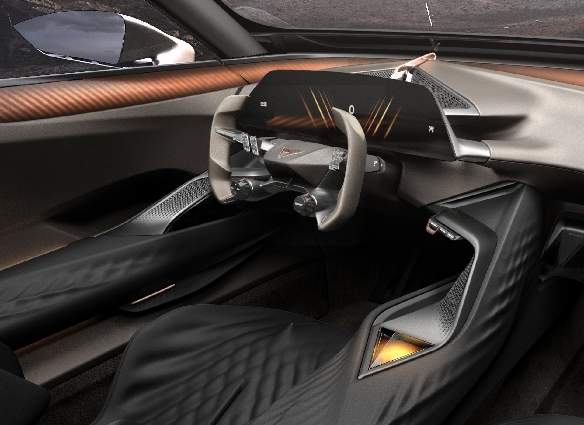 Задние двери CUPRA Tindaya открываются против движения, а центральные стойки крыши отсутствуют. В салоне установили четыре отдельных сиденья, разделенные высокой центральной консолью.