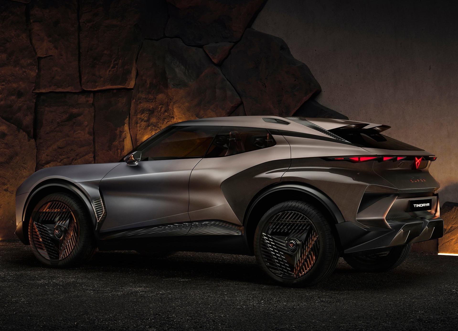 Новый CUPRA Tindaya — 4,7-метровый спортивный кроссовер с выразительным дизайном, созданный на современной платформе SSP. У него выраженный "нос", расширенные крылья и тоненькие фары. Авто получило агрессивный обвес, немалый спойлер и оригинальные 23-дюймовые диски.