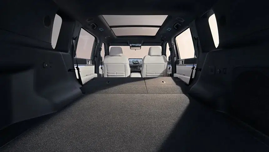Объем багажника со сложенными креслами второго ряда составляет 1880 л. Комплектация BYD FCB Tai 7 включает холодильник и акустику с 20 динамиками, а за доплату предлагают систему полуавтономного движения.