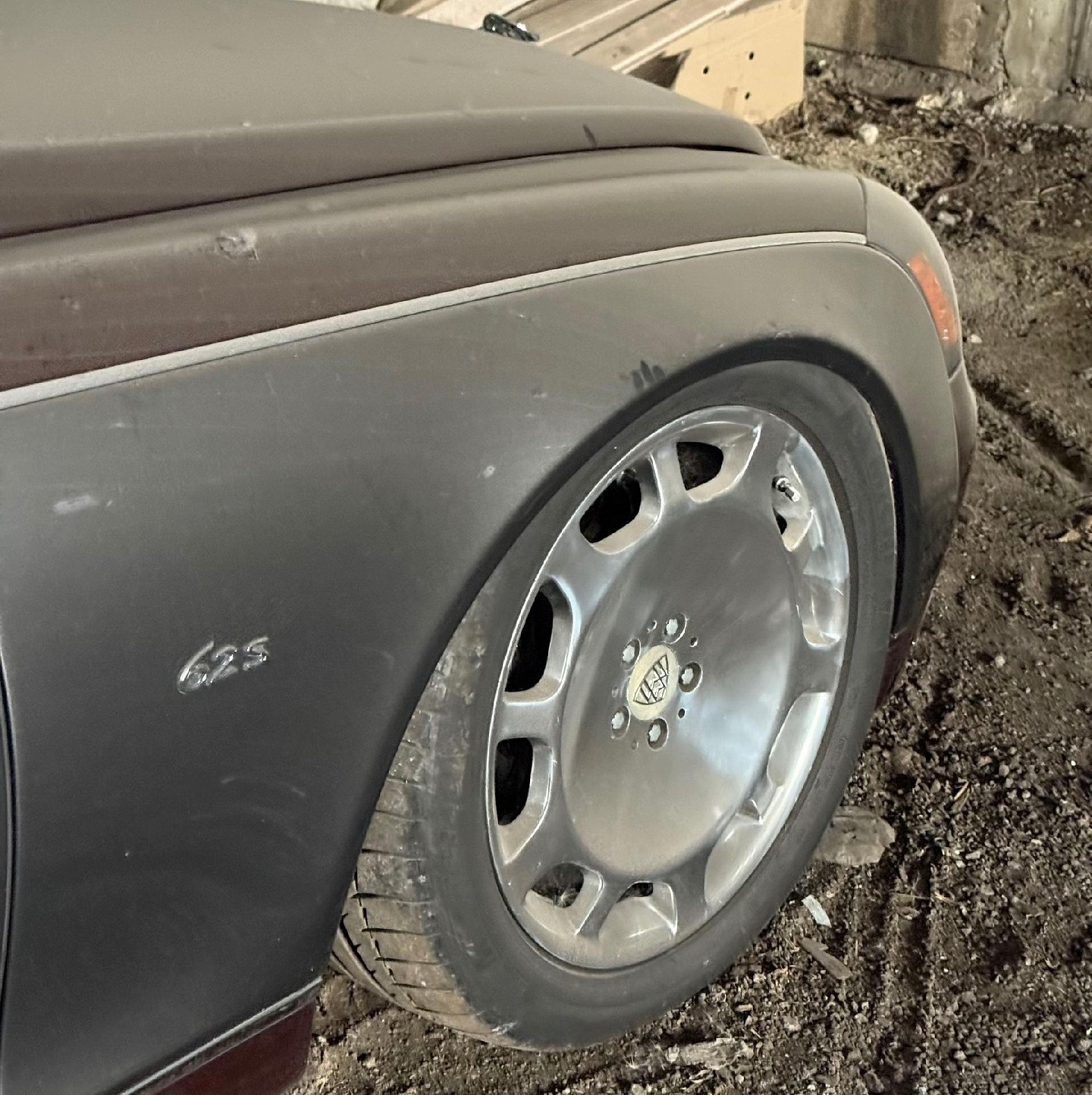 Судя по фото, состояние Maybach 62S можно назвать удовлетворительным. Он покрыт слоем пыли и грязи, а на кузове видны незначительные повреждения. Авто с опустилось: это свидетельствует о том, что оно длительное время не ездило или же имеют место неисправности пневмоподвески.