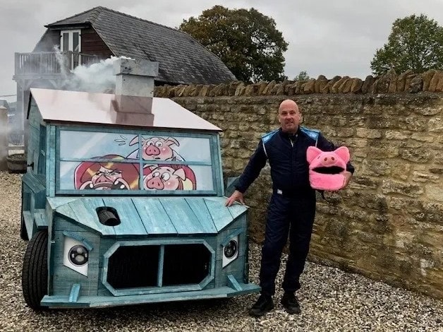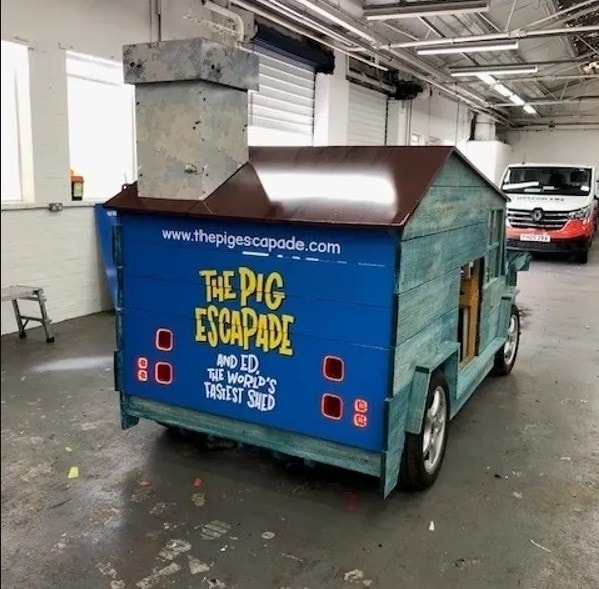 На шасси авто установили деревянный сарай с бутафорским дымоходом. Его выполнили в стиле иллюстрации к книге Брайана Кэда "Свиная эскапада", которая является осовремененной версией сказки о волке и трех поросятах.