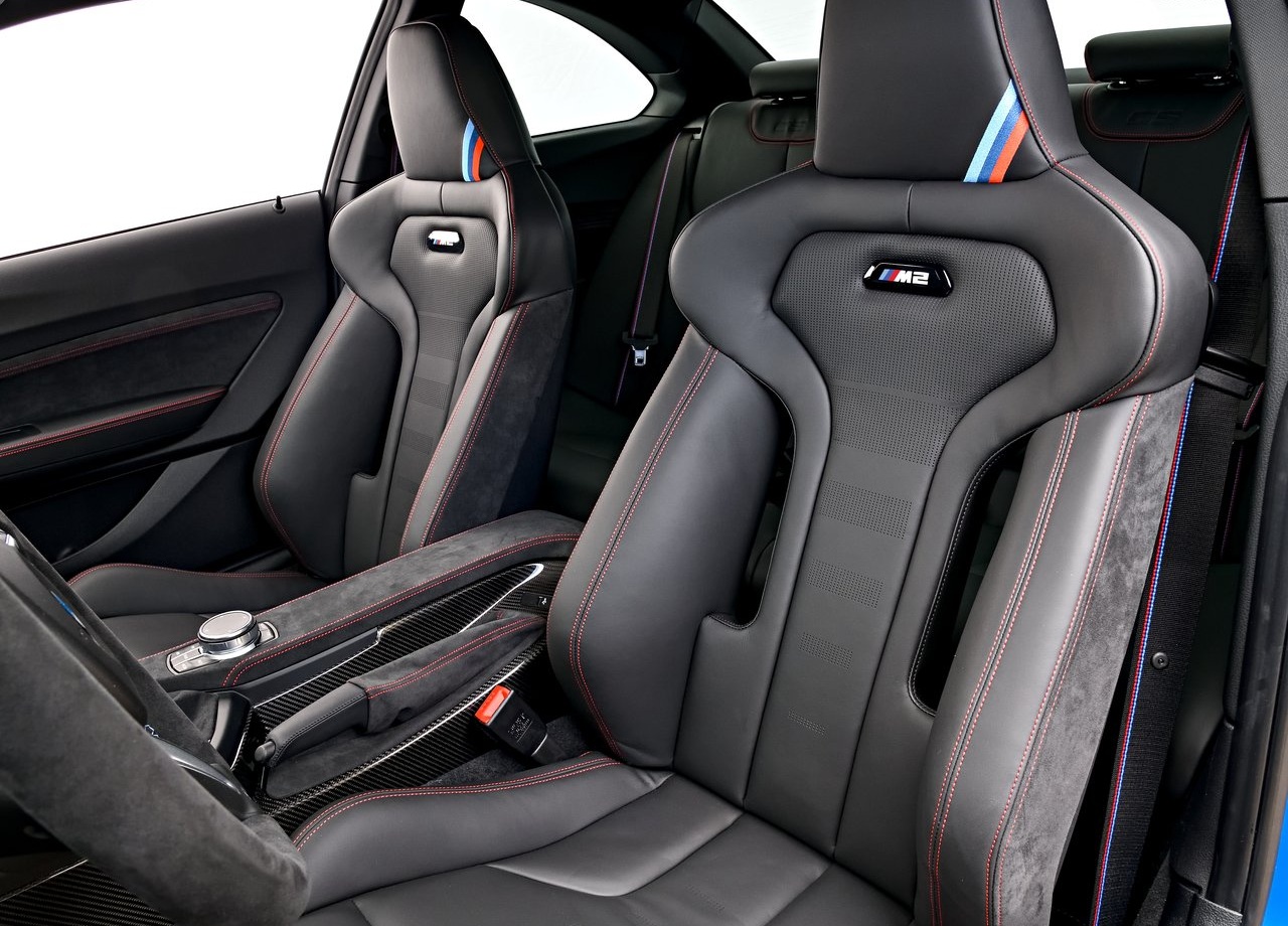 В салоне BMW M2 CS 2020 установлены спортивные кресла, а в отделке использованы карбон и алькантара.