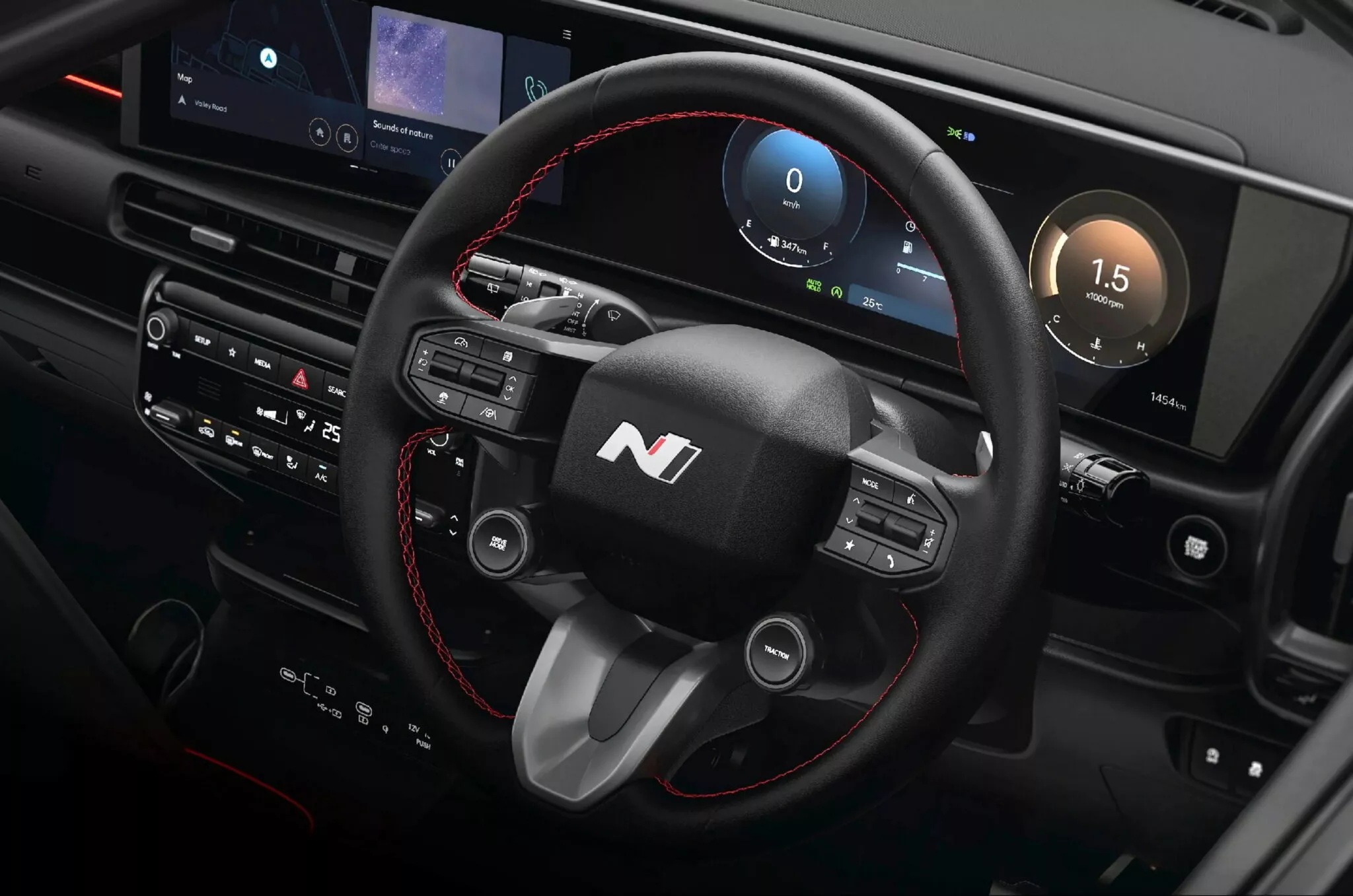 Салон Hyundai Venue N-Line отделан черной кожей с контрастными красными вставками и швами, а на педалях установлены металлические накладки. Кроссовер получил спортивный руль в духе заряженного Hyundai Ioniq 5N с подрулевыми переключателями передач. Комплектацию пополнили навигация, акустика Bose и распылитель духов.