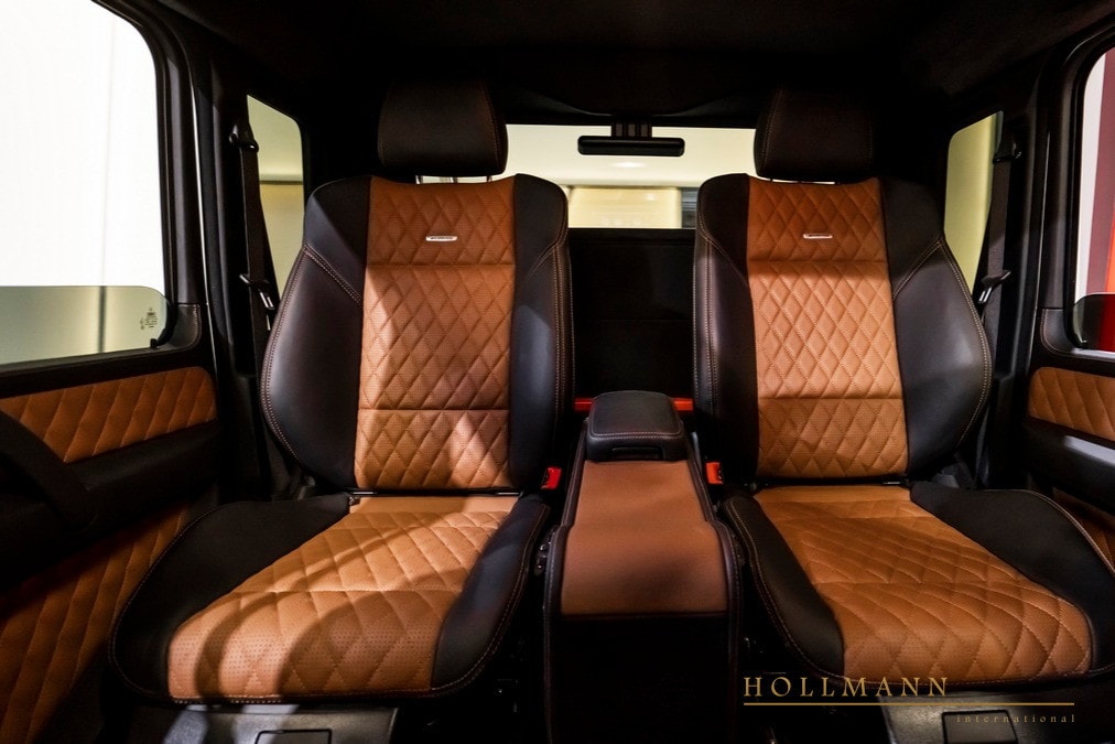 Салон этого Mercedes G63 AMG 6X6 отделан кожей, алькантарой и карбоном, а передние и задние кресла оснащены электроприводом, вентиляцией и подогревом. Авто получило ряд опций — мониторы для задних пассажиров, камеру и акустику Harman Kardon с DVD-плеером.