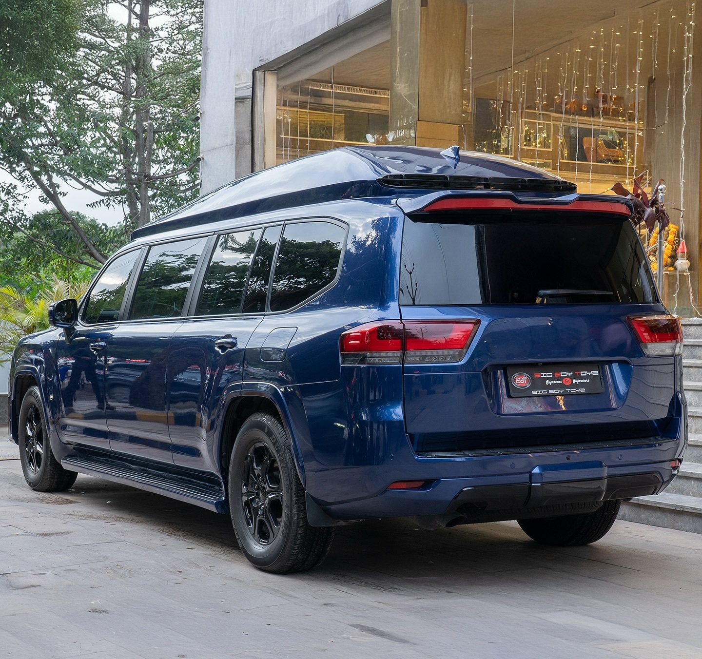 Также Toyota Land Cruiser 300 получил более широкую и агрессивную решетку радиатора. Появились обвес, подножки, спойлер на крыше и черный декор.