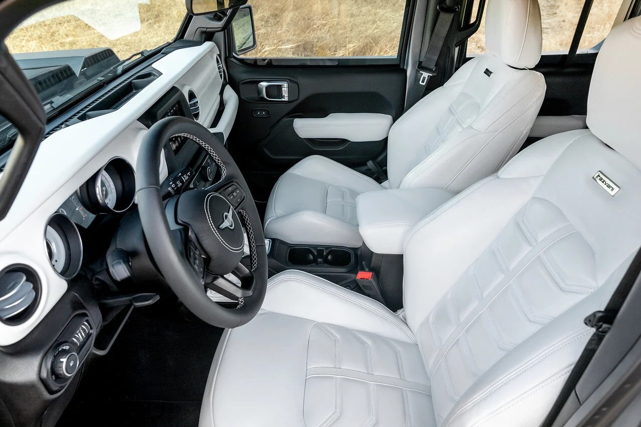 Салон Jeep Wrangler почти не изменился — его лишь обшили дорогой кожей. Также раскрыли перечень опций для Rezvani Tank. В пакете за 42 000 долларов предлагают дымовую завесу, противогазы, электрошокеры в дверных ручках и шины, которые не боятся прокола.