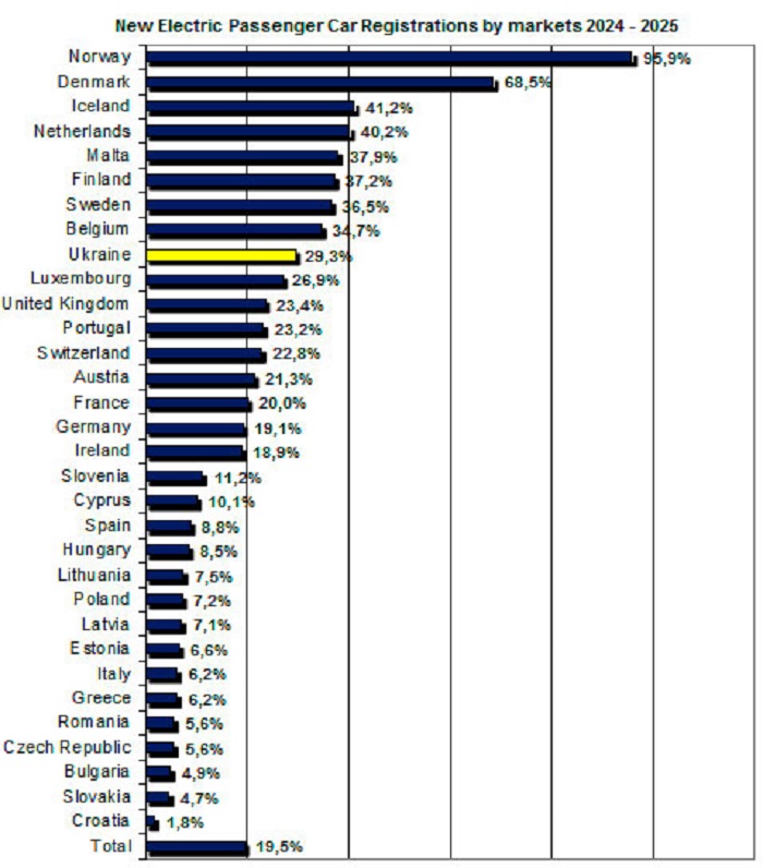 Электромобили в Украине составили 29,3% новых авто и по этому показателю Украина — в топ 10 стран-лидеров (занимает 9 место в Европе). В 2024 году наш рынок был на 15 месте с долей новых электрокаров в 16,1%.