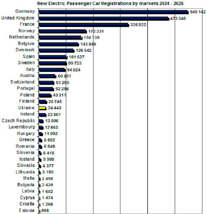 Если сравнить абсолютные цифры продаж, то украинский рынок электрокаров — 16-й в Европе (в прошлом году Украина была на 18 месте). Больше всего электромобилей в 2025 году продали в Германии (545 142 ед.), Великобритании (473 348) и Франции (326 922).