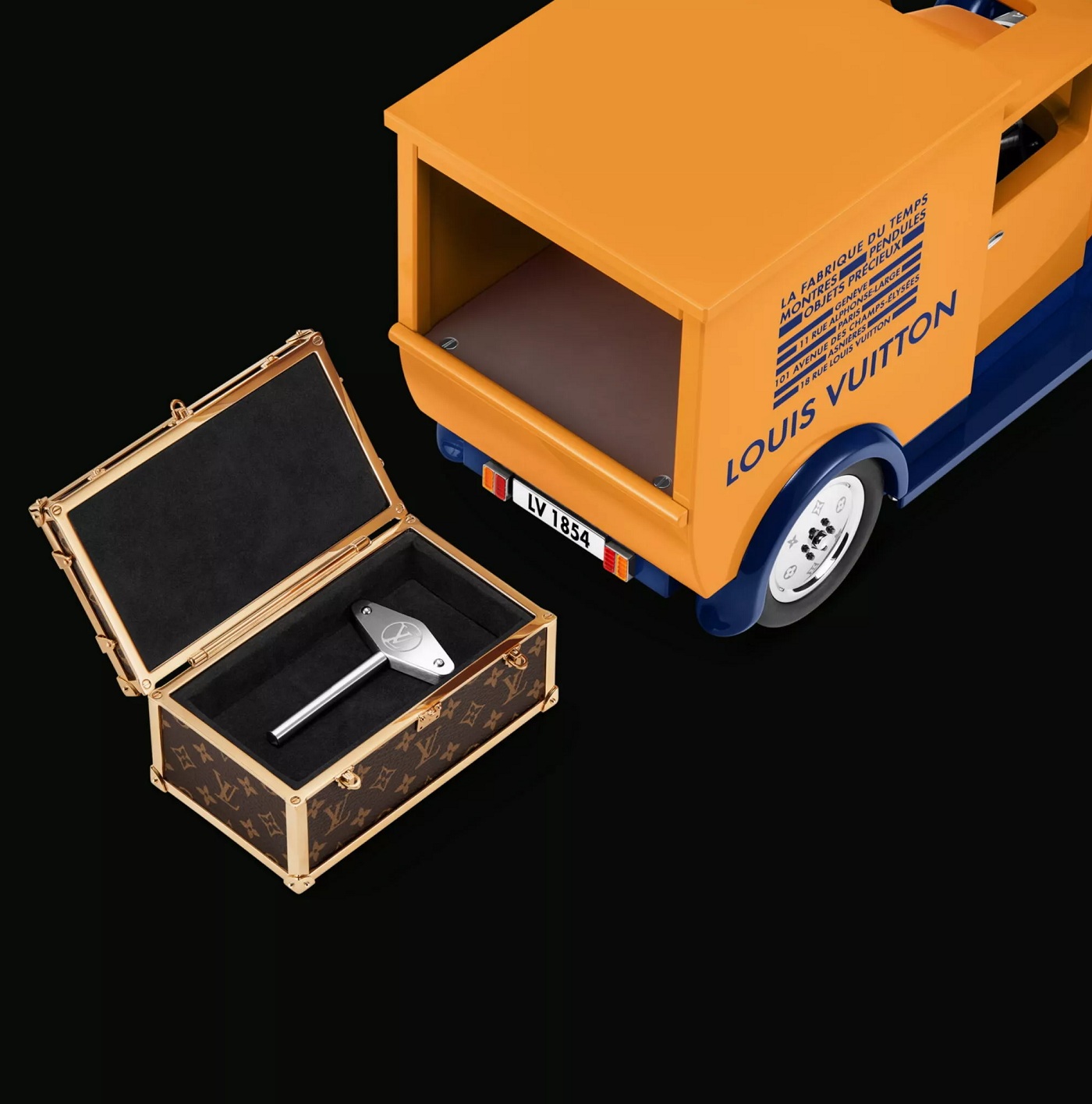 Машинка Louis Vuitton создана совместно со швейцарским производителем дорогих часов L'Epée 1839. Она отдаленно напоминает грузовики Citroen B10, которые развозили сумки и чемоданы Louis Vuitton в 1920-х годах.
