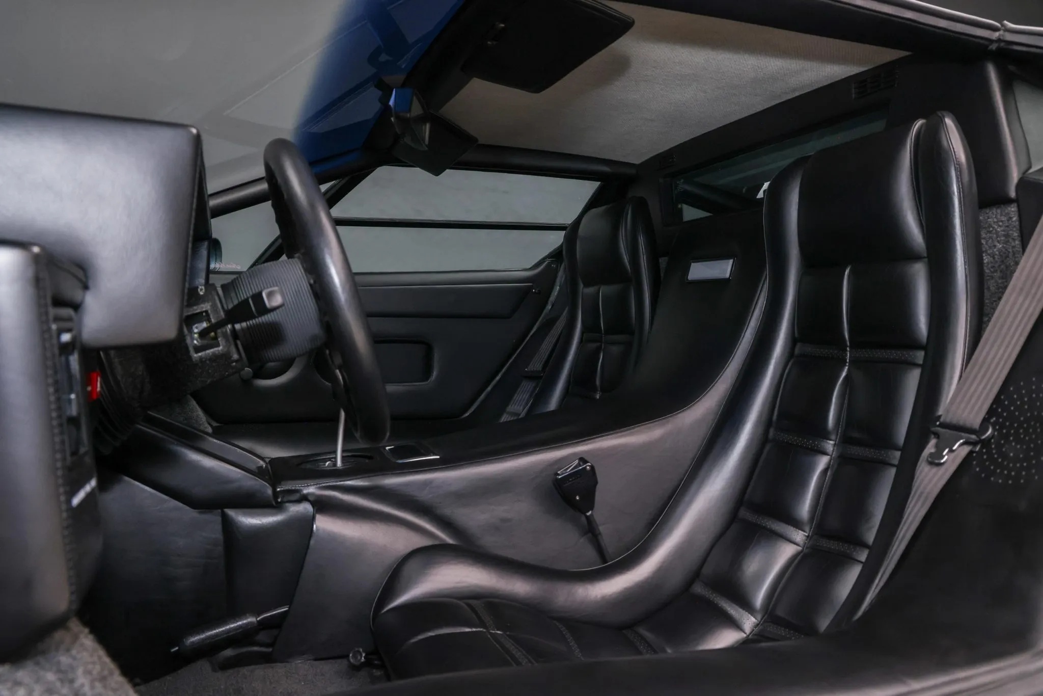 Салон Lamborghini Countach LP 5000 QV отделан черной кожей. Комплектация включает золотистые 15-дюймовые диски, кондиционер, магнитолу Alpine и огромное антикрыло.