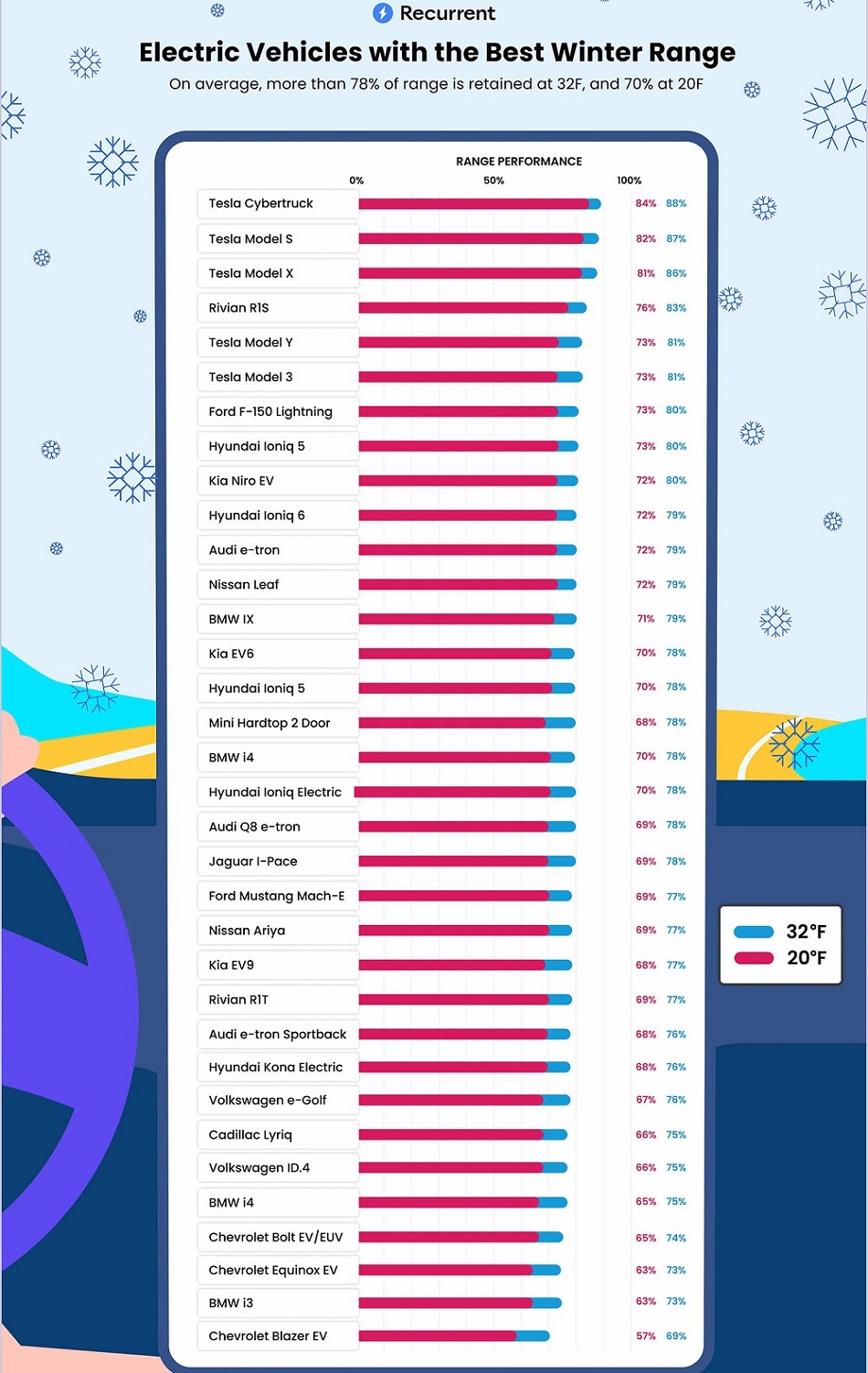 Победителем теста стал электропикап Tesla Cybertruck, который сохранил 88% паспортного запаса хода при 0° и 84% — при -7°. Второе место занял электромобиль Tesla Model S — 87% и 82%, соответственно.