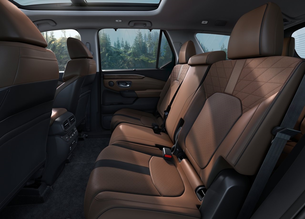 Honda Pilot предлагают в версиях на 7 и 8 мест, а объем багажника кроссовера составляет 635-3219 л. Во всех версиях установлены два экрана на передней панели.