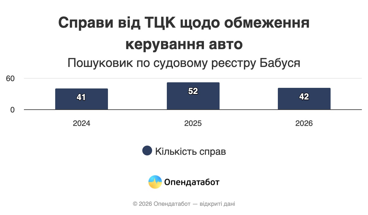 Всего в Украине на данный момент зафиксировано минимум 135 дел об ограничении прав водителей, из них рекордные 42 — в этом году. Такую статистику публикует "Опендатабот".