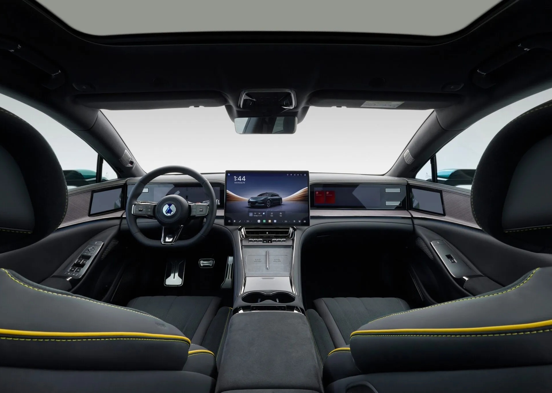 Электромобиль BYD Denza Z9 GT довольно богато оснащен. Его салон отделан кожей, а на передней панели установлены три экрана. Также есть проекция на лобовое стекло, электропривод и вентиляция сидений, панорамная крыша, камеры вместо зеркал, холодильник, пневмоподвеска и управляемые задние колеса.
