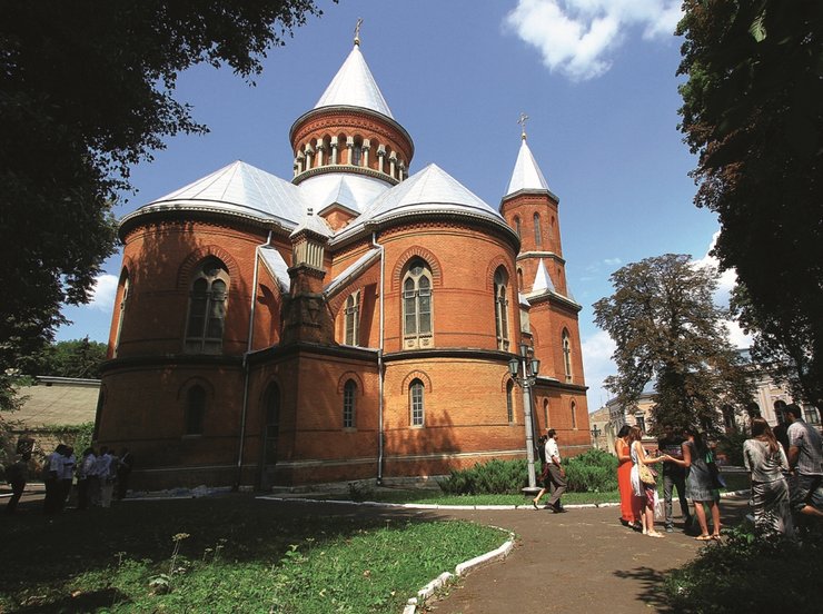 А напротив стоит костел Воздвижения Честного Креста (1814 г.) с солнечными часами на боковой стене. Голос храма — орган, получивший в 1870-е годы медали в Вене и Париже за лучший в Европе тембр. Сейчас в костеле правят службы на польском, украинском и немецком языках, а в большие праздники звучит еще и румынская речь.