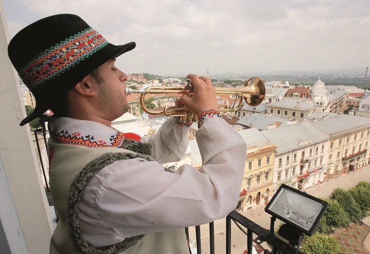 Во внутреннем дворе ратуши (1847 г.) с 50-метровой башней в последнее время проходят фотовыставки. На балкончике, откуда виден весь город, раньше круглосуточно дежурил пожарный, а с 2004 года ежедневно в полдень трубач играет мелодию песни "Марічка". На ратуше два часовых циферблата: тот, который на фронтоне, а не на башне — подарок бургомистра Антона Кохановского.