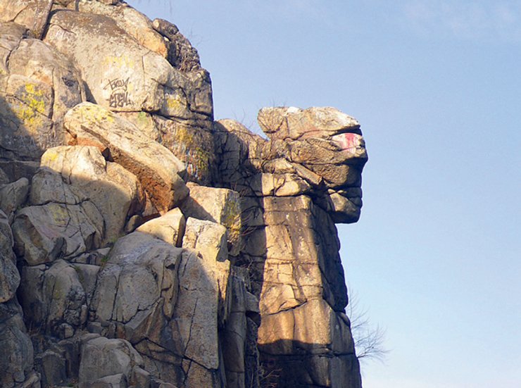 Голова Чацкого. Ничего общего с персонажем грибоедовского "Горя от ума" название житомирской скалы не имеет. Есть версии о польском просветителе и общественном деятеле Тадеуше Чацком; о преследуемом казаками польском шляхтиче, бросившемся тут в воду; о бедняке, чью дочку захотел похитить богач. Но самая популярная легенда говорит об отважном воине, оборонявшемся от монголо-татарских полчищ. Хитростью он заманил на скалу сотню татар, после чего его конь ударил копытом о скалу так сильно, что ее кусок рухнул в Тетерев, увлекая за собой всех воинов. После этого оставшаяся часть скалы стала похожа на голову героя.
