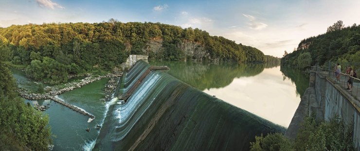 Если посмотреть с моста против течения реки, вдалеке виднеется обелиск и высокая плотина, похожая на водопад. Если осталось время — нам туда: можно пройти по уютным прибрежным улочкам, а можно подъехать на транспорте, идущем в сторону Гидропарка. К плотине можно пройти через Парк славы; чуть выше по течению на левом берегу над рекой нависает скала Голова Чацкого.