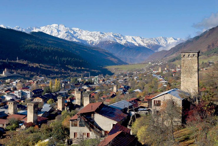 Компактная деревушка в верховьях реки Ингури с первого взгляда кажется голливудской декорацией, только очень старой. А вершины-пятитысячники, до которых рукой подать, будто нарисованы на стене. Это невероятно живописное и уютное местечко (даже несмотря на то, что тут сплошные альпийские луга и ни одного дерева) совершенно невозможно осмотреть за пару часов. Хочется просто сесть на холме и любоваться на закат. А потом — на рассвет.