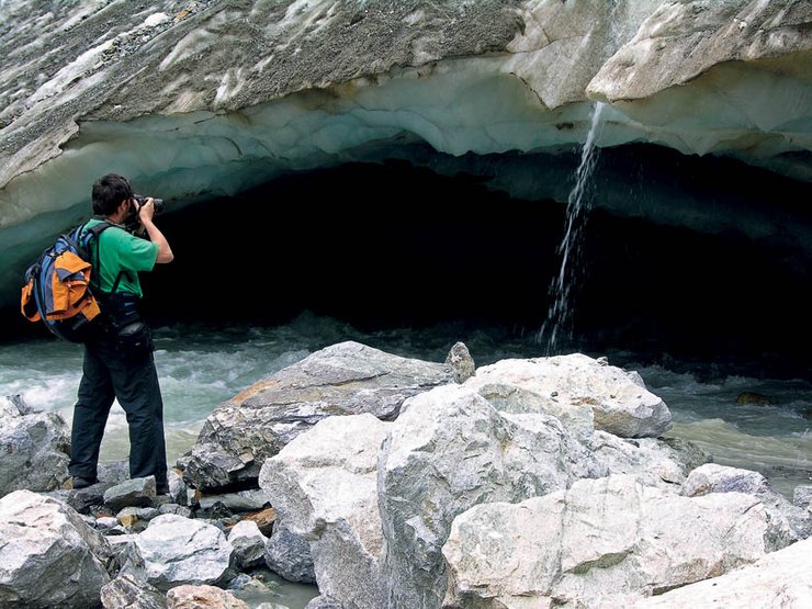 Ледник открывается взору в конце маршрута. Он красив, огромен и суров. Очень хочется подойти поближе, но это довольно опасно из-за постоянного камнепада. Из-под ледника, из еле видной расщелины, бьет мощный поток ледяной воды. Если подойти поближе, оказывается, что это не расщелина, а грот в два человеческих роста.