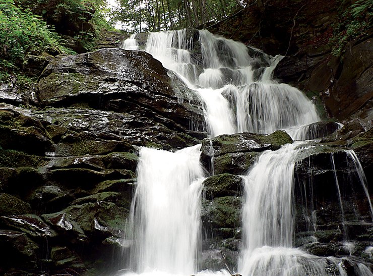 Если же от Великого Верха пойти налево, тропа приведет вас к водопаду Шипот. Найти правильную дорогу к нему, с лестницами и ровной тропинкой тоже удастся не сразу. Однако пропустить водопад сложно: хотя он и расположен в укромной расщелине и поначалу не очень заметен, в тихом лесу грохот воды слышен отчетливо. Тем более что это один из крупнейших водопадов Карпат, особенно полноводный весной, когда его питают ледники, тающие на склонах гор. Тогда вода устремляется с нескольких уступов и дальше впадает в горную реку.