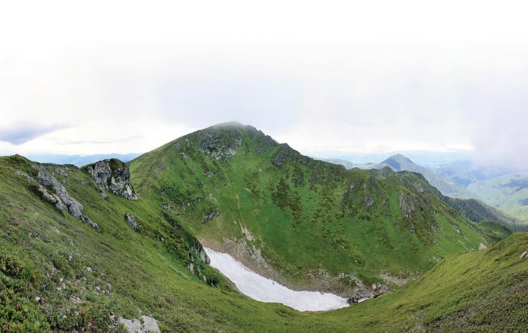 Через просеки дорога приводит к горе Мезипотоки (1713 м) и полонину под ней. Там в теплый период вас опять ждет встреча с пограничниками, которые живут в небольшом домике и стерегут границу. На полонине удобно ночевать — рядом вода и ровная площадка для палаток. Далее путь лежит через вершины Мика-Маре (1815 м) и Корбул (1696 м). Те, кто уже устал, могут обойти хребет с украинской стороны, но тогда не будет видно румынский пик Феркеу (1958 м), живописно возвышающийся над всеми северными румынскими горами.