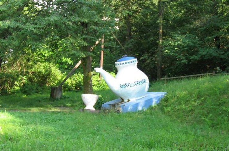 Придорожный родник представляет собой большой бетонный расписной чайник, стоящий на постаменте. Из его носика течет чистая родниковая вода.