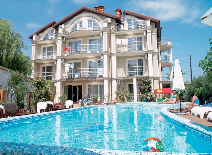 Отель находится в курортном райончике Затока на песчаной Каролино-Бугазской косе, омываемой Черным морем. Здесь есть большой открытый и детский бассейны, зона отдыха с шезлонгами и гамаками для принятия солнечных ванн и площадка для детворы.