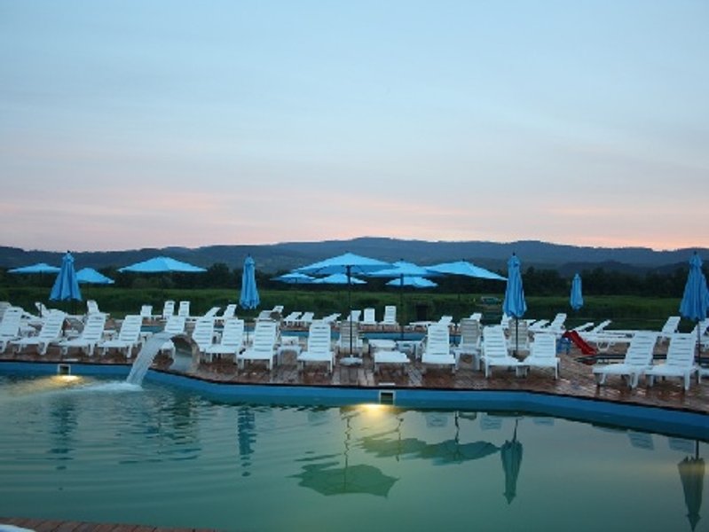 Перебираемся поближе к горам. Фишкой этой базы отдыха, в отличие от предыдущих, является бассейн, вернее, целых два бассейна. Но есть здесь и озеро с собственным пляжем и лежаками.