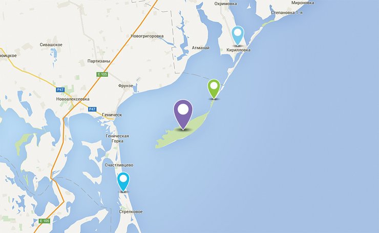 Второй маршрут — автодорога через село Кирилловка, что в соседней Запорожской области. Но только при условии хорошей погоды, когда шторм не перемывает Федотову косу.