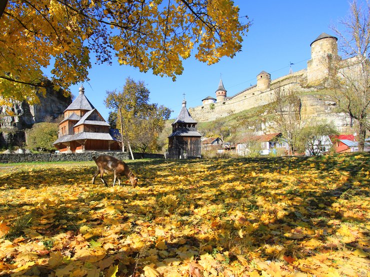 В популярном Каменец-Подольском есть места, где туристов мало, а красоты много. Одно из них — аккурат под Старой крепостью. Деревянную Крестовоздвиженскую церковь неплохо видно с Замкового моста, но она внизу, в каньоне. Туристы решают не идти, а зря. Тут фантастически красиво: с севера церквушку в подольском стиле защищает замок, с запада — отвесная скала каньона, с востока — река Смотрич.