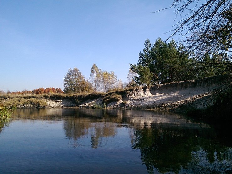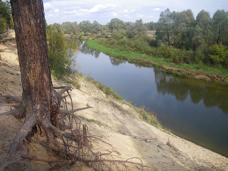 Река Тетерев на нашем пути станет визиткой Полесья. Фотогеничный песчаный обрыв с сосновым лесом находится на левом берегу недалеко от трассы. Спускаться с обрыва неудобно, поэтому искупаться лучше ближе к трассе, где берега низкие.