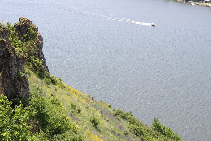 Грунтовка выводит прямо к скале над Днестром. Вид вокруг просто потрясающий. Эту гору, а точнее, товтру, местные жители называют Козяча церква. Стоя на камнях и глядя с высоты, сложно поверить, что Подольские Товтры — это бывшие коралловые рифы доисторического Сарматского моря.