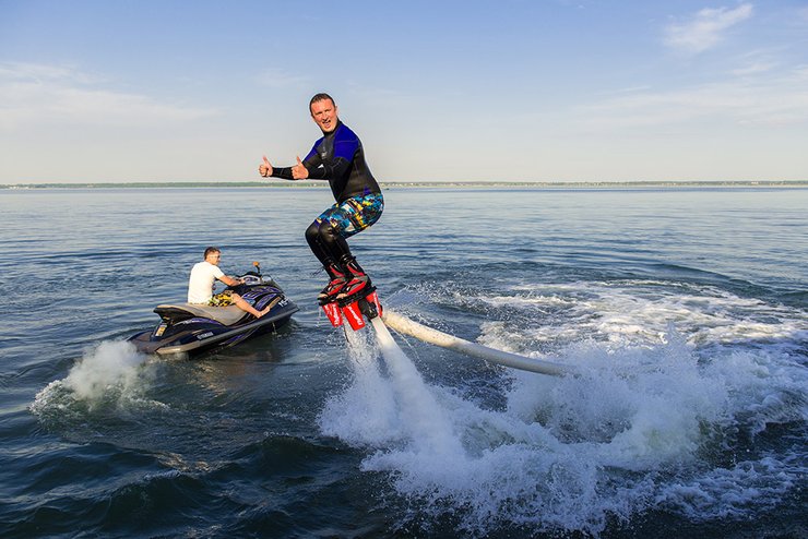Человек в прямом смысле слова парит над водой, а поднимает его в воздух реактивная сила воды, которую приводит в действие гидроцикл. Обучение здесь проходит достаточно быстро, многие моменты понятны интуитивно, важно научиться держать баланс. Обучение с инструктором занимает 10–20 мин., без инструктора — от 30 мин. до часа. Требования минимальны: вы должны быть старше 16 лет и весить менее 100 кг. В Киеве около Московского моста стоимость 10-минутного катания с инструктажем — 640 грн, 30-минутного сеанса — 1600 грн. В стоимость включены сам полет, инструктаж и экипировка (шлем, спасжилет, гидрокостюм).