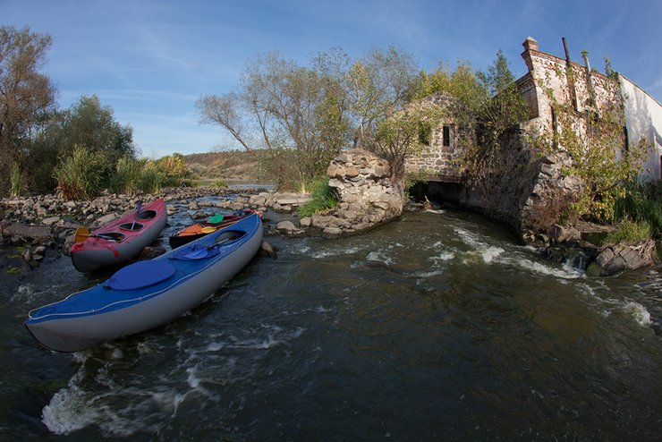 Но сперва подъедем к мельнице Скаржинского, превращенной в ГЭС. Для этого, спустившись в балку посреди села, свернем направо и проедем около 1 км по грунтовке вдоль реки вверх по течению. Интересна и сама мельница, и открывающийся с нее вид на речной порог и огромный камень Коваль посреди русла.