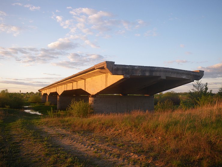 Едем дальше в направлении Несолони и сворачиваем на грунтовку направо. Здесь Тню пересекает мост из ниоткуда в никуда. Он выглядит мистически, но история его вполне реальна. Магистраль Емильчино — Могилев-Подольский строили в начале 1940-х годов, но из-за войны "cтроительство 221" прекратили. От "сталинского автобана" осталась идеально ровная просека, которую видно на спутниковых картах. В селе Несолонь есть еще один бетонный мост — взорванный.