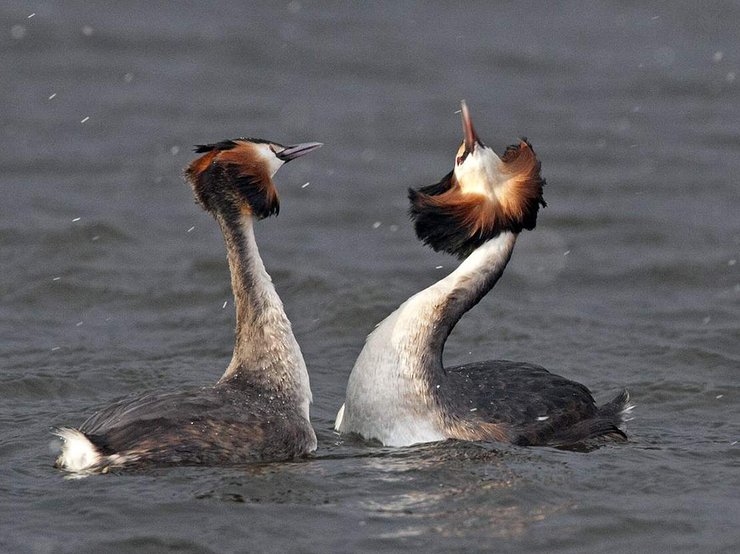 Чомги все время проводят в воде. Их перья больше похожи на шерсть животных и защищают птиц от переохлаждения. Чомги ловят рыбу, при этом могут находиться под водой больше минуты. Встречаются на водохранилищах и широких водоемах.