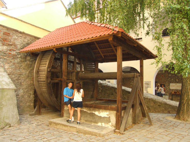 Поднимать воду с такой глубины нелегко, потому иногда около колодцев устраивали огромное деревянное колесо. Несколько человек крутились в нем, как белки в колесе, — все ради того, чтобы добыть воду.